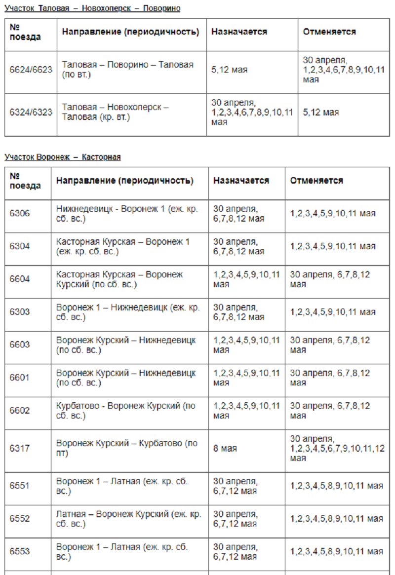 Расписание электричек на майские праздники в Воронежской области