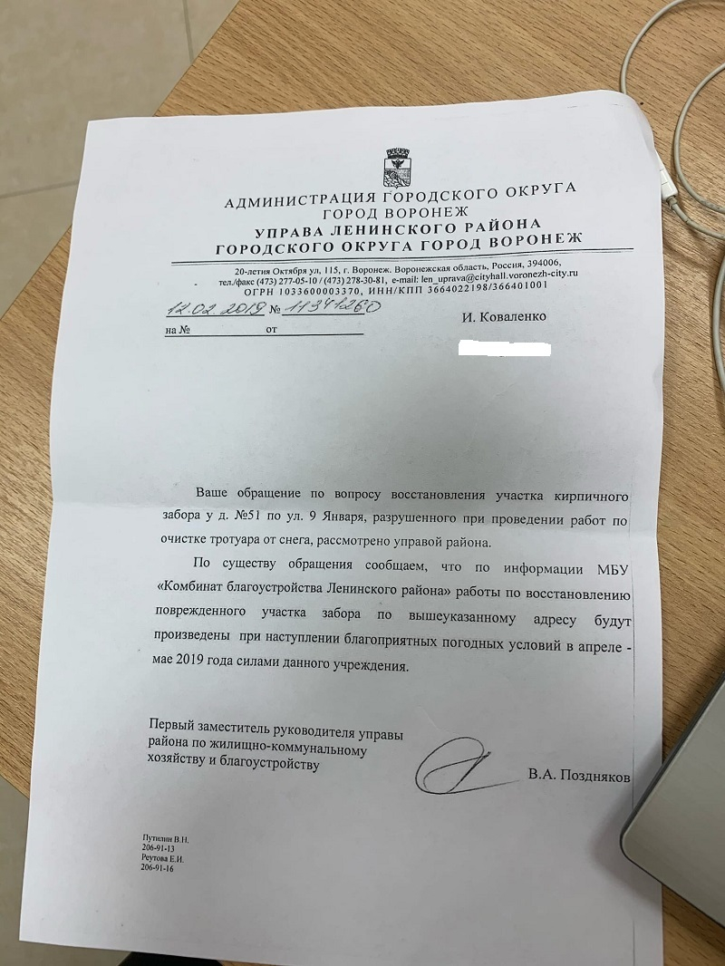 "Блокнот Воронеж" по этому поводу обратился за официальным комментарием в пресс-службу администрации города. Нам сообщили, что "по информации управы района, задача по восстановлению поврежденного участка забора по адресу ул. 9 января, 51 действительно ставилась районному комбинату благоустройства".
