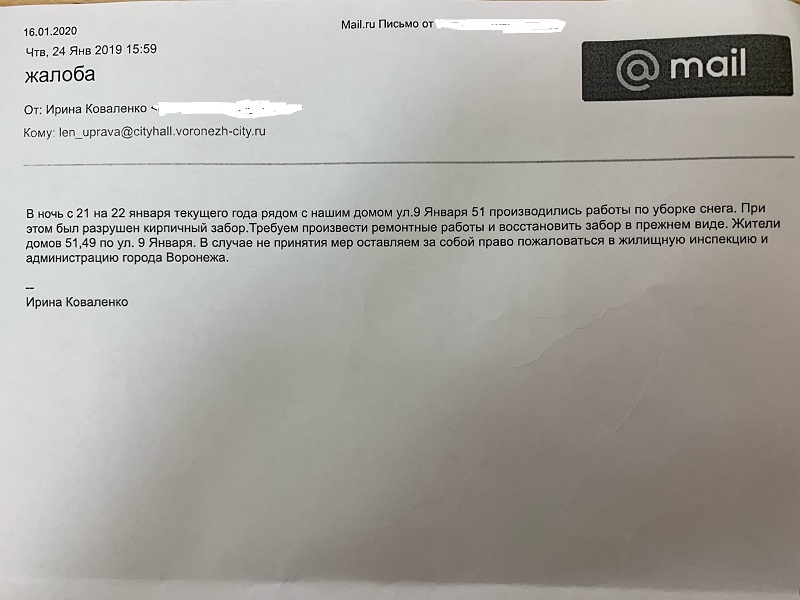 В редакцию "Блокнот Воронеж" обратилась Ирина Коваленко. Она проживает по адресу улица 9 Января, 51. Женщина сообщила, что в ночь с 21 на 22 января 2019 года рядом с ее домом проводились снегоуборочные работы, в результате которых был разрушен кирпичный забор.