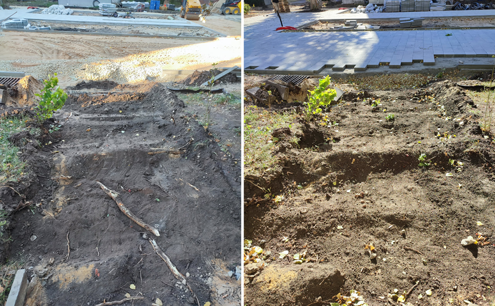 При этом, геноцид корневой системы деревьев и не думает останавливаться. Вот один из таких примеров (фото слева). Правда следы повреждения дерева стараются скрыть (фото справа).