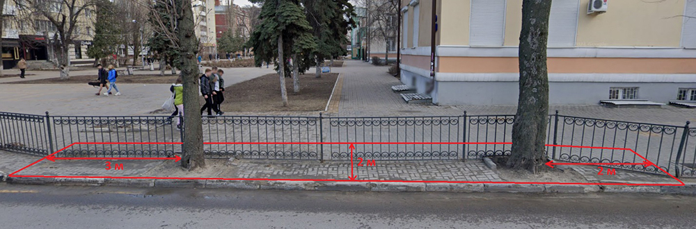С другой стороны улицы в зону ремонта попадают 2 каштана – нужно сделать им объединенный газон шириной не менее 2 метров и отступить не менее 2 метров от края ствола по длине.