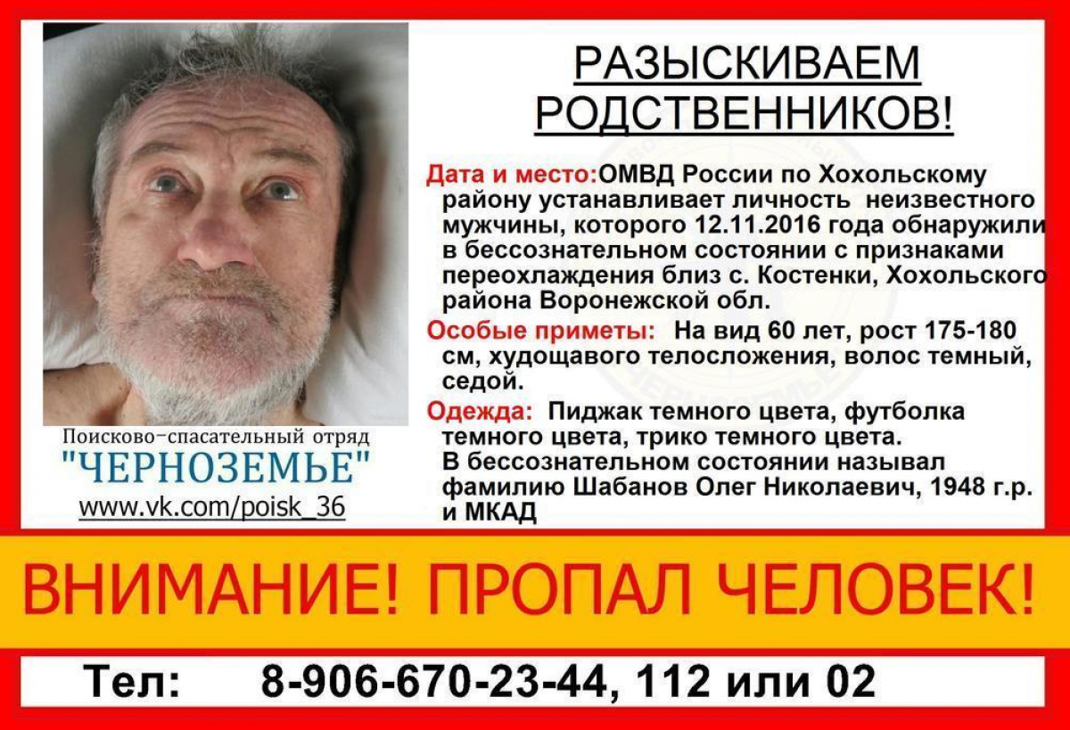 Неизвестного обнаружили 12 ноября 2016 года в районе села Костенки. У мужчины были признаки обморожения, он не понимал, что происходит. В бреду пенсионер называл имя Олега Николаевича Шабанова и говорил, что ему 70 лет. На вид мужчине около 60 лет, рост 175-180 см, волосы седые, худощавое телосложение. Был одет в трико, темный пиджак и темную футболку.