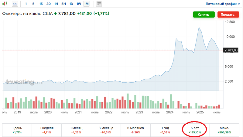 Редакция интереса ради взглянула на график стоимости фьючерсов на какао. Действительно, в двадцатых годах произошел резкий скачок, который поднял стоимость в разы. С октября 2022 года его стоимость выросла более, чем в три раза. Для сравнения, с 2019 по 2022 год его стоимость практически не менялась. Стремительный рост цен на какао эксперты связывают со старением плантаций в Западной Африке. Деревья, которые кормили весь мир шоколадом долгие десятилетия, начали массово гибнуть.