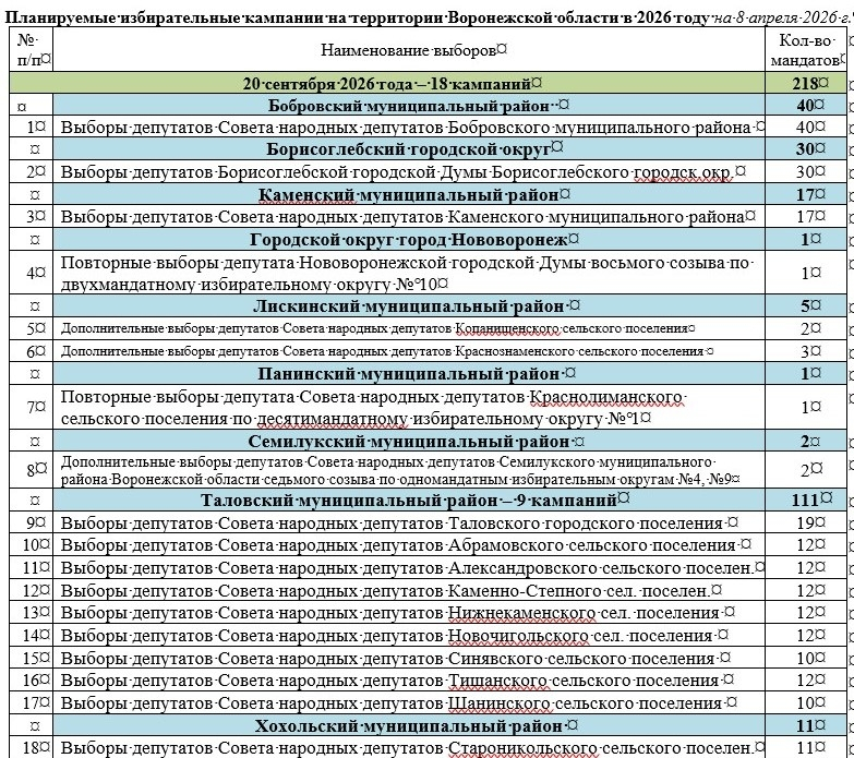 Кроме того, в Единый день голосования, который пройдет 20 сентября текущего года, в Воронежской области состоится еще 18 избирательных кампаний разных уровней. Ознакомится с ними можно на этом изображении.