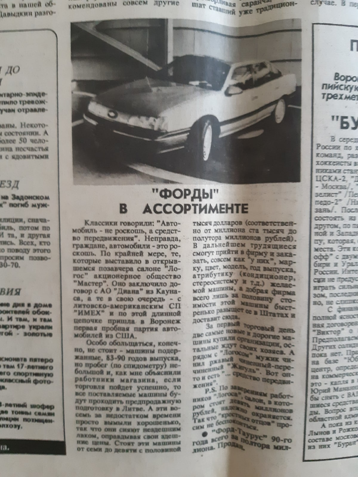 27 июля 1992 года в городской газете «Воронежский курьер» выходила короткая рекламная заметка об автосалоне «Логос». В материале рассказывалось о том, как эта организация выставила на продажу множество американских автомобилей марки Ford. Точнее пригнали машины по сложной цепочке. Акционерное общество «Мастер» заключало договор с АО «Диана» из Каунаса, а эта компания, в свою очередь, имела контракт с неким литовско-американским СП «ИМЕХ». Таким путем из Соединенных Штатов Америки прибывала в Воронеж первая партия автомобилей Ford.