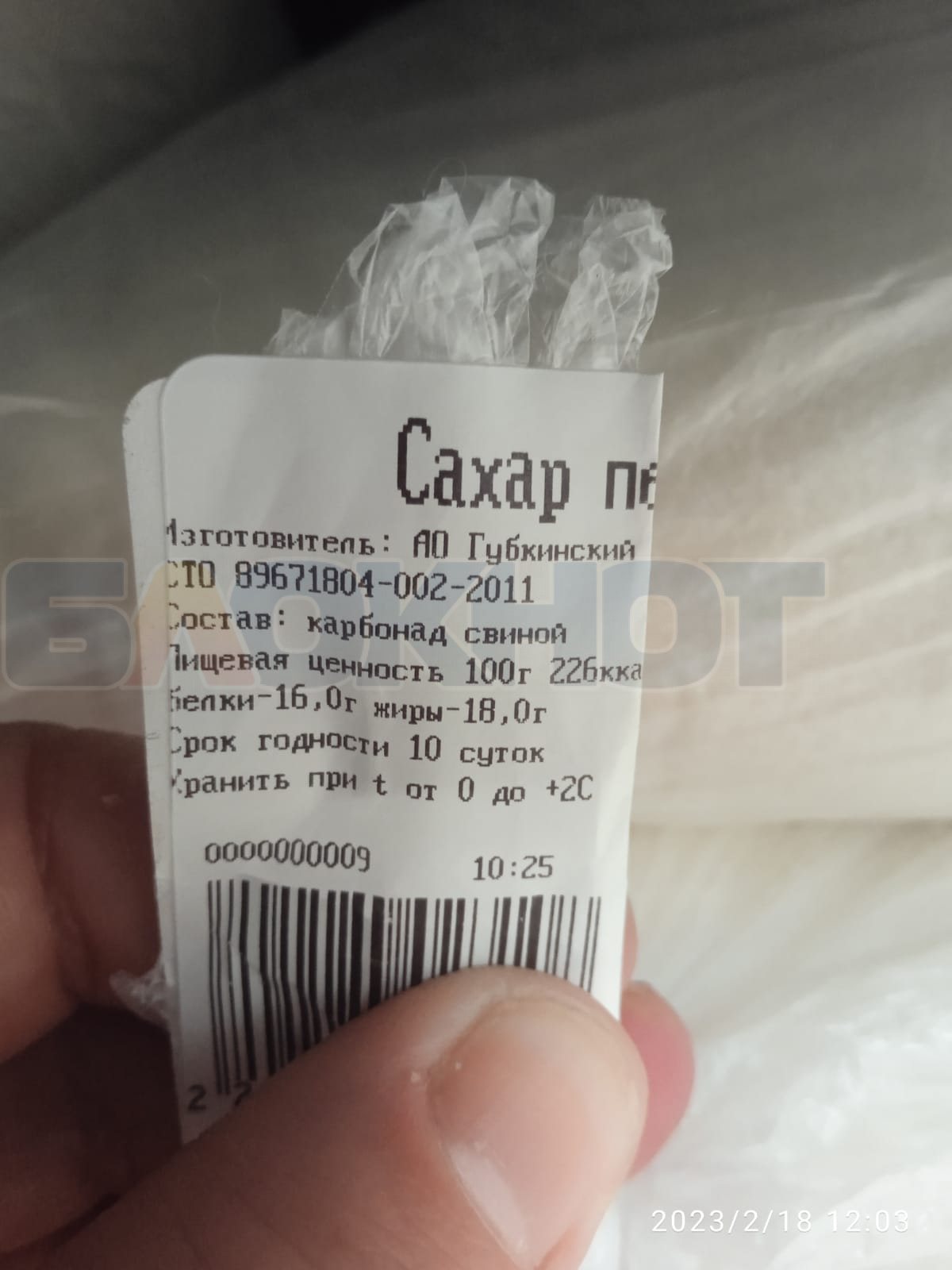 На этикетке, прикрепленной к целлофановому пакету, было сказано, что в состав сахара входит…карбонад свиной. И хранится он всего 10 суток.