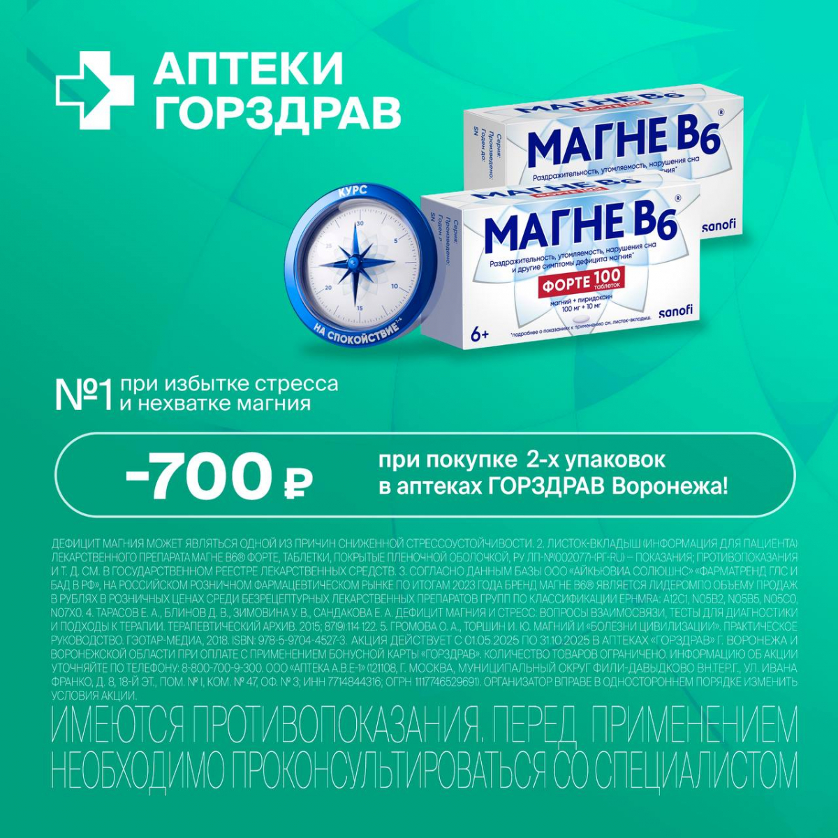 Выгодная цена на «Магне B6®» в Воронеже — в аптеках «ГОРЗДРАВ»!