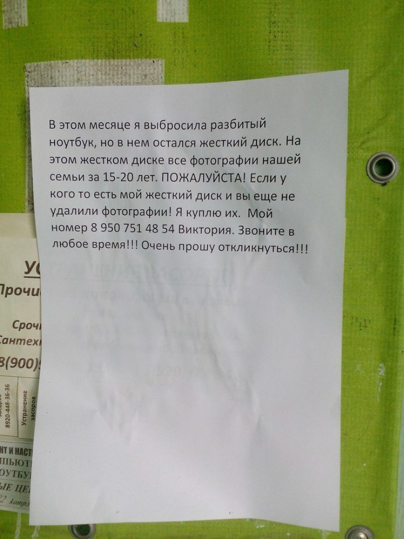 - Если у кого-то есть мой жесткий диск и вы еще не удалили фотографии, я куплю их! Мой номер 8(950)751-48-54. Виктория. Звоните в любое время. Очень прошу откликнутся! – написала женщина в своем объявлении.