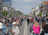Площади буквально сияли от флагов, георгиевских лент и тематических декораций. Утро началось с возложения цветов к Вечному огню на Площади Победы. Горожане приходили семьями, приносили гвоздики, минутой молчания чтили память павших воинов. На проспекте Революции тем временем уже кипела жизнь: со сцены звучали любимые песни военных лет, работали тематические зоны, люди делали фотографии на фоне праздничных плакатов.