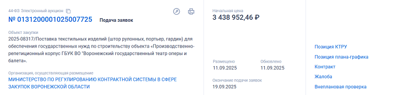 Но это мы подробно разобрали лишь один из рулонов. В целом, там к каждому свои требования. Например, портьеры должны быть сотканы из бархата и крепиться многоуровневым усиленным металлическим рельсом (это, видимо, для сцены). А гардины требуют поставить из вуали. Заявки от подрядчиков принимаются до 19 сентября.