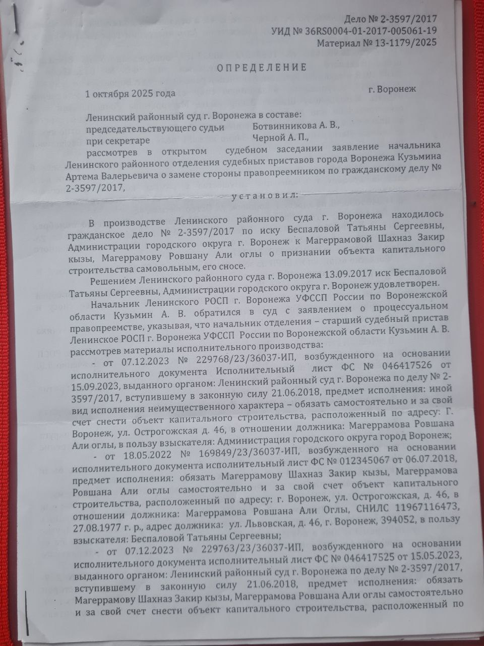Общественник Константин Квасов рассказал «Блокнот Воронеж», что обязанность по сносу самовольной постройки была возложена на Барцева еще в июне 2025 года, когда он оформил на себя земельный участок на Острогожской, 46. Поскольку новый собственник не предпринимал никаких действий, городская администрация в сентябре подала два судебных иска: один о взыскании неустойки в размере около 3 млн рублей с Магеррамовых за неисполнение вердикта, второй – об изъятии территории у Барцева, который не приступал к сносу.