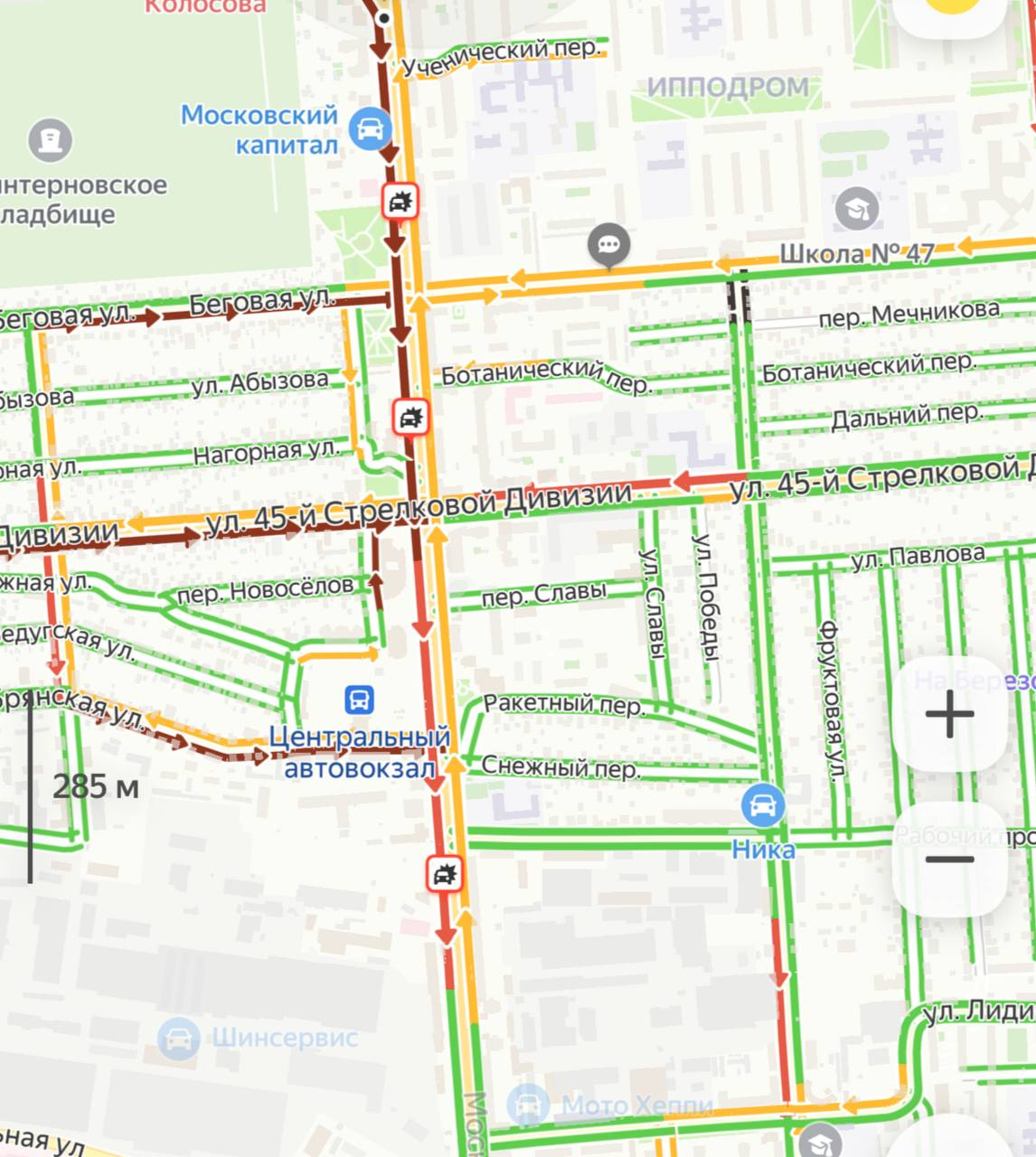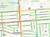 На картах полный крах: весь Московский проспект быстро стал "багровым". Причиной этому, вероятно, стали три ДТП, которые очень сильно препятствовали движению.