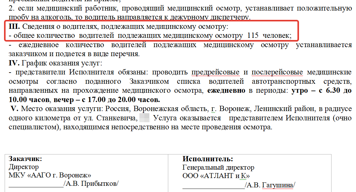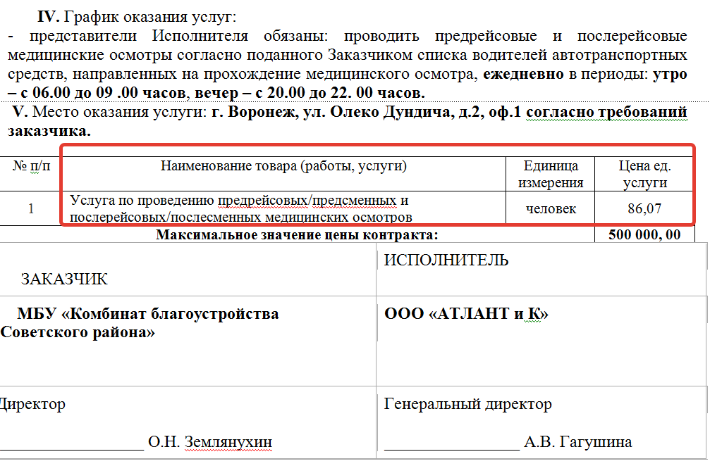 Местное ООО "АТЛАНТ и К" будет оказывать медицинские услуги водителям, работающим в муниципальном казенном учреждении «Автобаза администрации городского округа город Воронеж». Их в муниципальной организации 115 человек, они заняты в основном перевозкой чиновников мэрии.