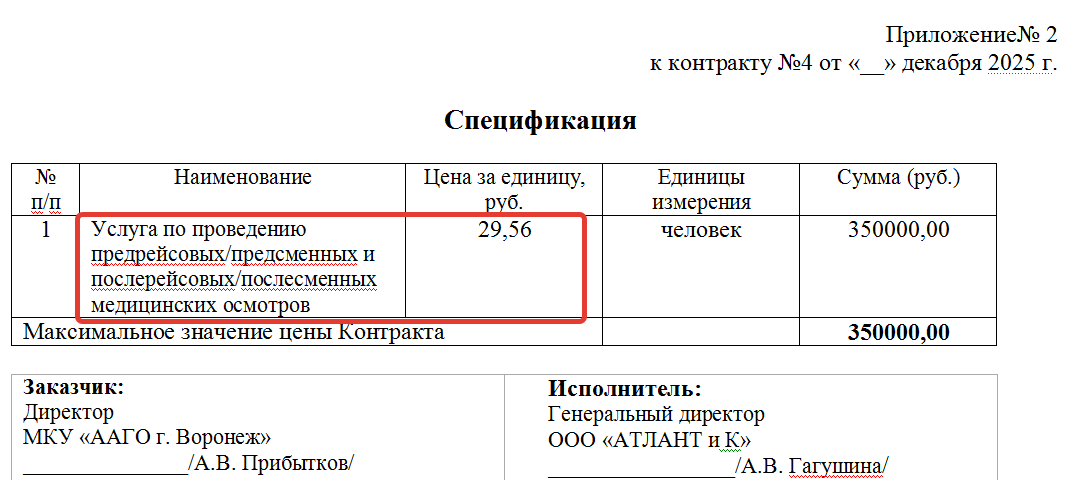 Это даже на 6 копеек меньше стоимости той же самой услуги, которая оказывалась ООО АТЛАНТ и К» этому же заказчику, но в рамках июньского контракта (от 17 июня до 31 декабря 2025 года), на сумму 350 тысяч рублей.