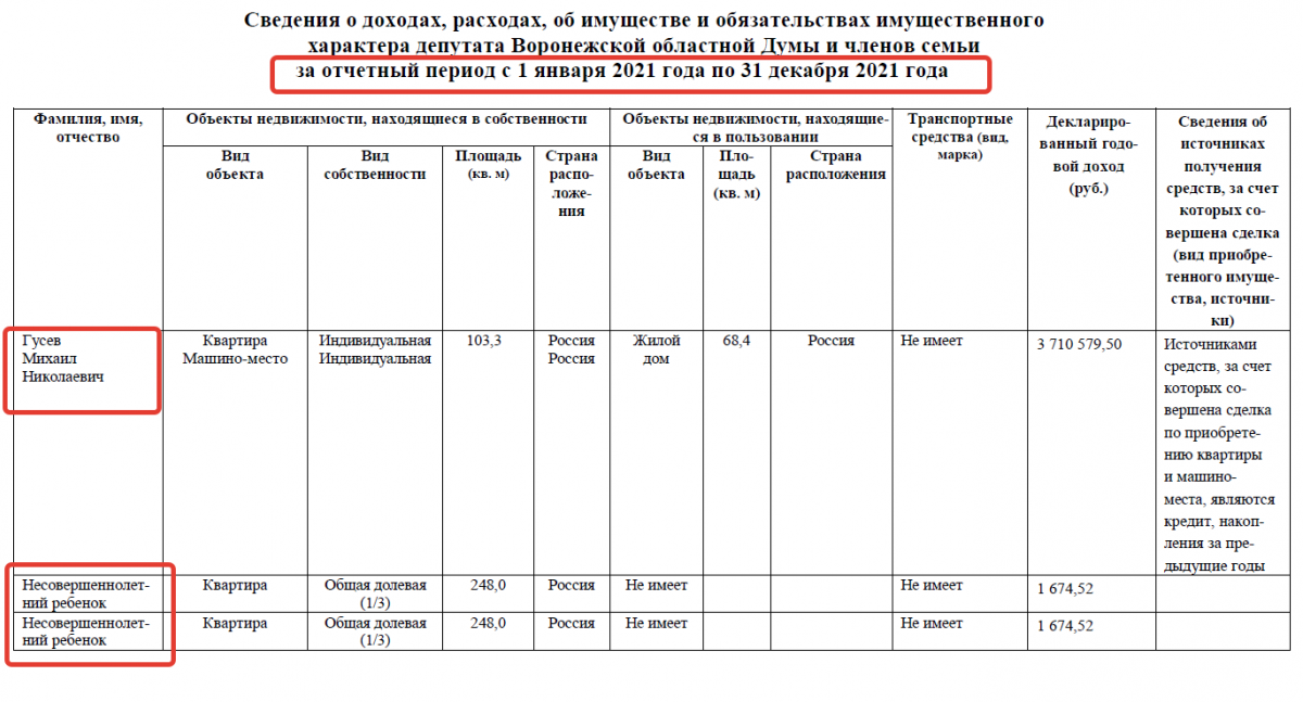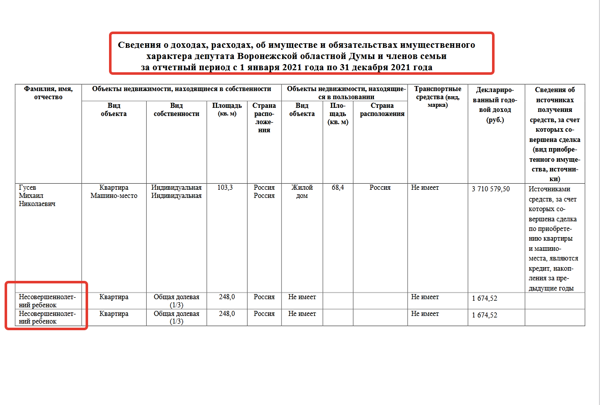 Так вот, предыдущие последние опубликованные данные облдумы по Михаилу Гусеву, они за 2021 год, таковы: у депутата – было два несовершеннолетних ребенка. А через три года, а может, и раньше, у Михаила Гусева появился еще один несовершеннолетний ребенок.