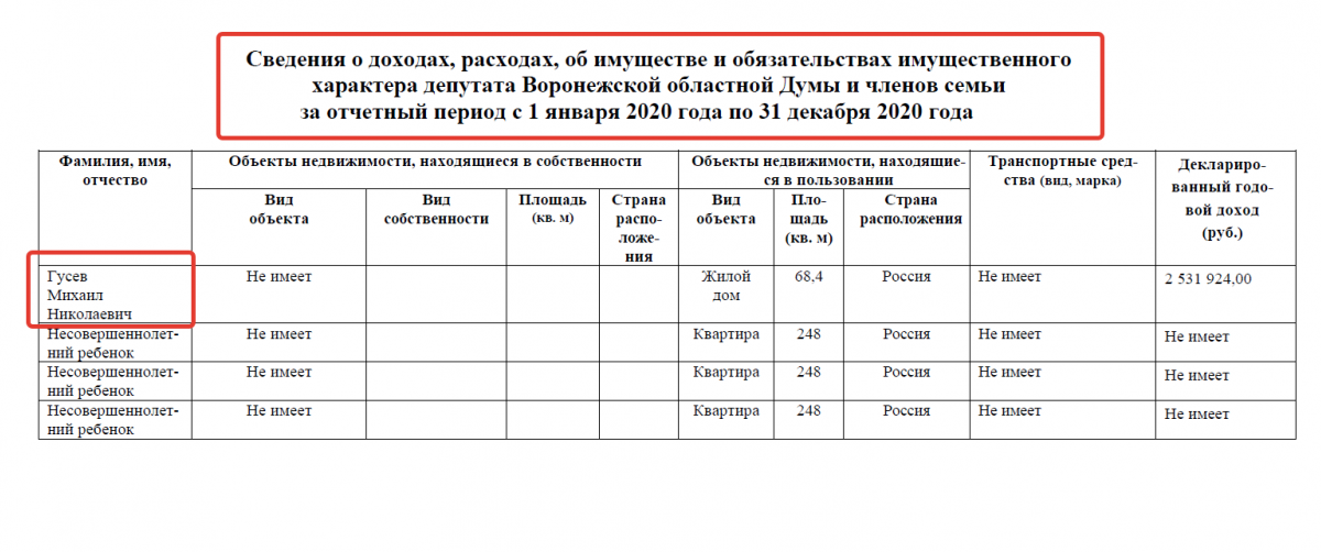 А ведь годом ранее, в 2020-м, ситуация в семье Михаила Гусева была иной: тогда у него было три несовершеннолетних ребенка, а в собственности – ничего. Правда, у трех детей было написано, что у них находится в пользовании (но не в собственности) чья-то квартира в 248 кв. м.