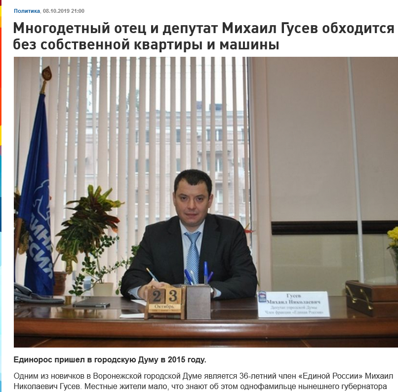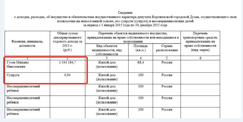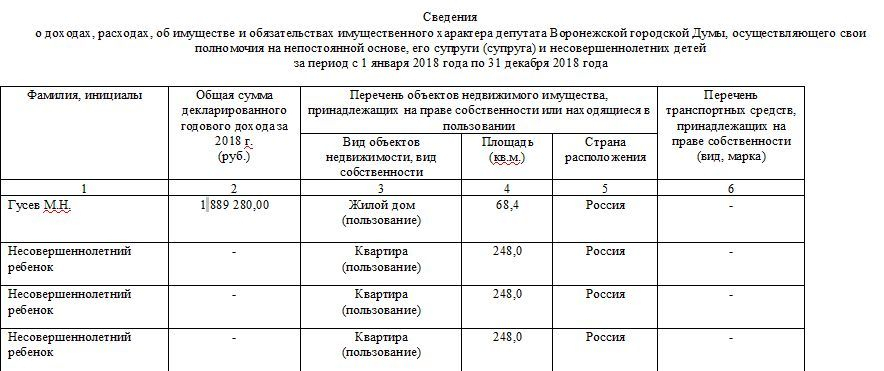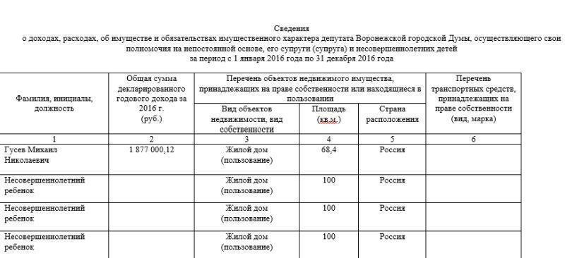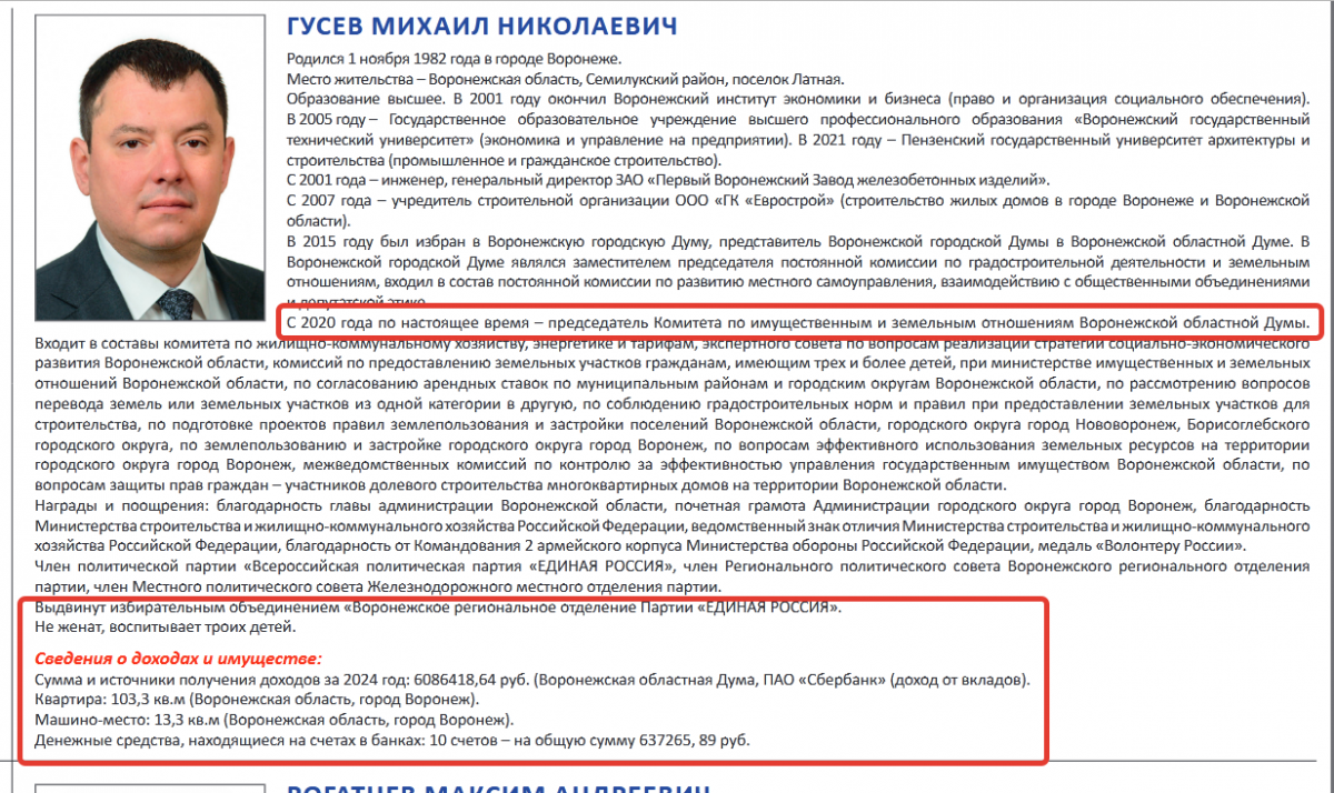 скриншот сайта Воронежской облдумы, у депутата Михаила Гусева трое несовершеннолетних детей, а в собственности ничего нет.