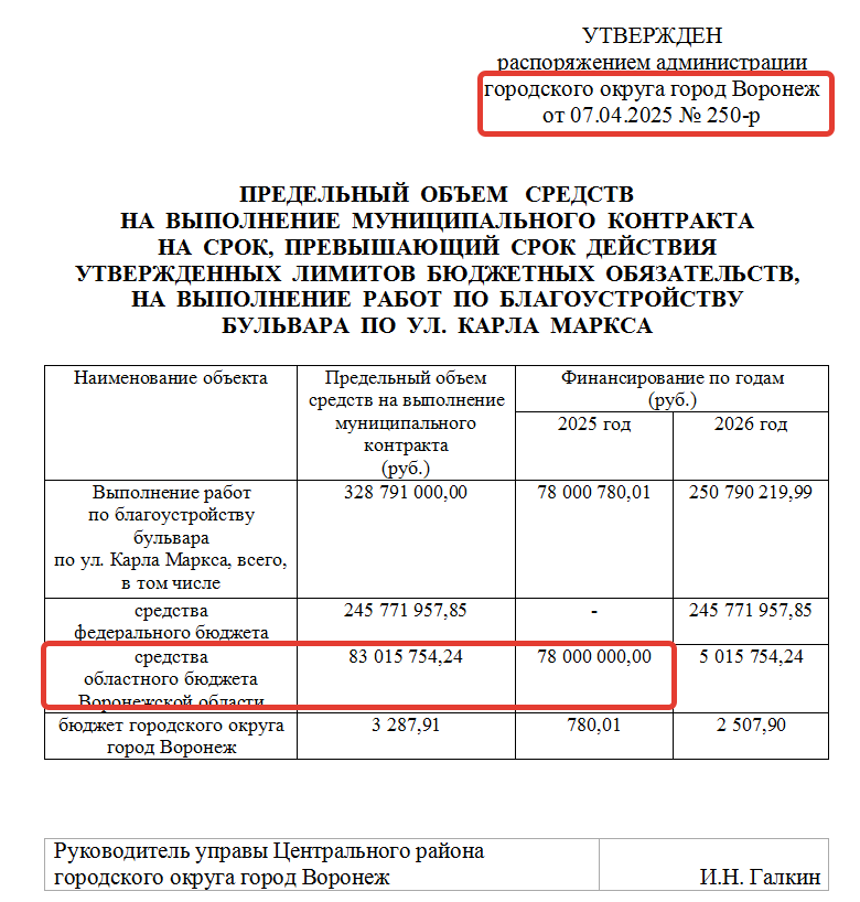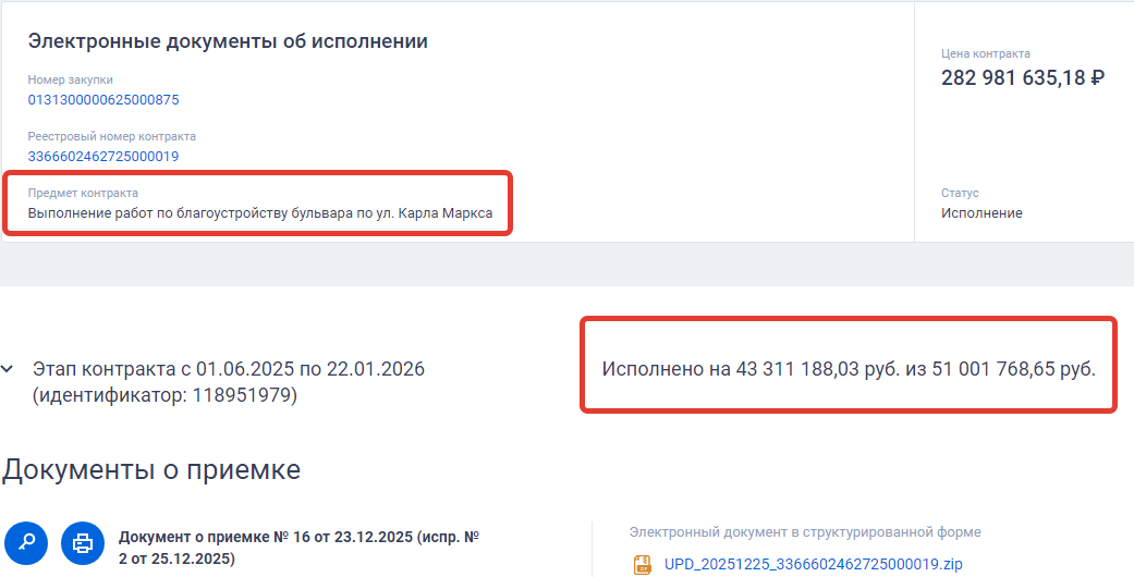 В целом бюджетное исполнение данного контракта выглядит не совсем благополучным: в 2025-м году планировалось «инвестировать в воронежский Арбат» 78 млн рублей. На сайте госзакупок сейчас виды такие цифры по исполнению: