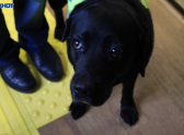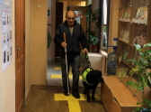 Еще один посетитель библиотеки по имени Леонид, пока мы общались с Олегом, беседовал о чем-то своем с психологом. В ногах его покорно ждал пес-поводырь в желтой отражающей жилетке.