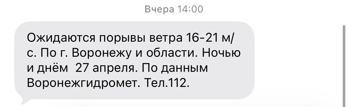 Еще 26 апреля на мобильные телефоны воронежцев приходило оповещение от МЧС. В экстренном предупреждении сообщалось, что ночью и днем 27 апреля ожидаются порывы ветра, скорость которых достигнет 16–21 метра в секунду. В связи с этим, в регионе объявлен желтый уровень погодной опасности.
