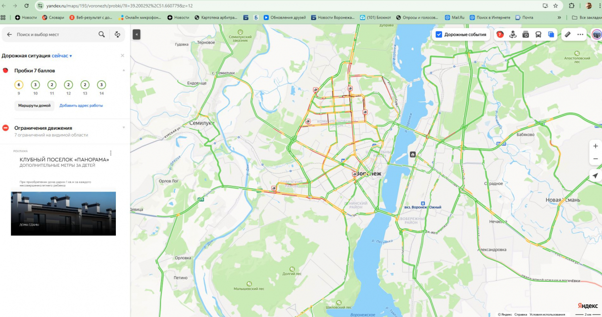 Сервис «Яндекс. Пробки» показывает, что глубина заторов составляет 7 баллов. И это при том, что в городе не работает навигация. На карте утренние пробки в Воронеже выглядят так: