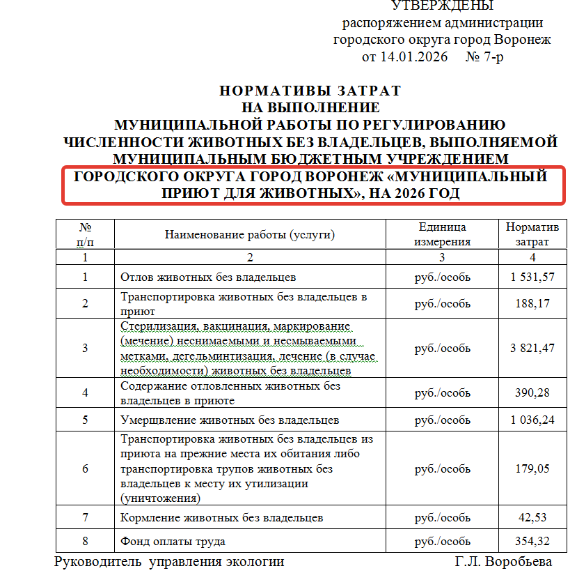 Мэрия Воронежа объявила на 2026 год новые нормативы затрат по регулированию численности животных без владельцев. Стоимость этих услуг, оказываемых бюджетным учреждением «Муниципальный приют для животных», на первый взгляд, кажется небольшой. Однако на деле это не так: только одна полная услуга по «регулированию численности животных без владельцев», например, одной бездомной собаки, может составлять месячный прожиточный минимум одного воронежского пенсионера.