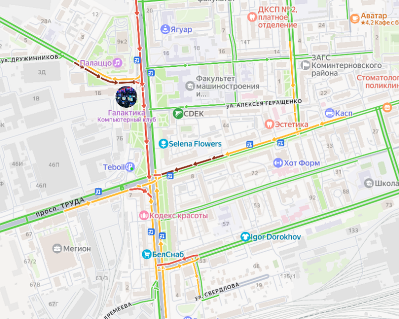 Тем не менее, «Яндекс» разглядел заторы на памятнике Славы, на бульваре Победы, на той же Шишкова, на Девицком выезде, на Свободы, у Цирка и небольшую пробку на Космонавтов. На левом берегу на картах все чистенько.