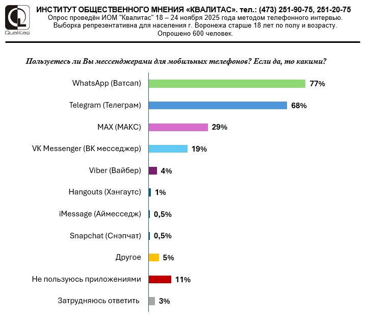 Институт общественного мнения «Квалитас» провел социологическое исследование среди воронежцев на тему мессенджеров, которыми они пользуются. Опрос представлял из себя телефонное интервью. Выборка репрезентативная среди 600 жителей Воронежа старше 18 лет по полу и возрасту. При этом исследование было выполнено до того, как власти стали усиливать давление на ряд зарубежных сервисов.