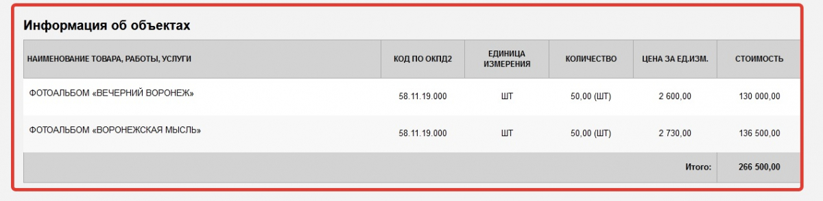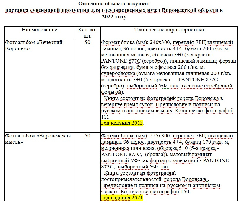 В техническом задании объекта закупки сообщается, что данные фотоальбомы должны представлять из себя красочные книги из фотографий Воронежа, в том числе в вечернее время суток. Общее число фотографий в одном издании должно быть 111, в другом – 150. Судя по всему, заказанные фотоальбомы должны повторять тематические издания, выпущенные в 2013 и в 2021 годах.