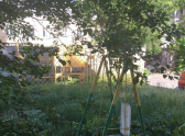 Из бурьяна наружу еле проглядываются яркие детские качели, песочница и брусья, которые сложно заметить в насыщенной зелени.