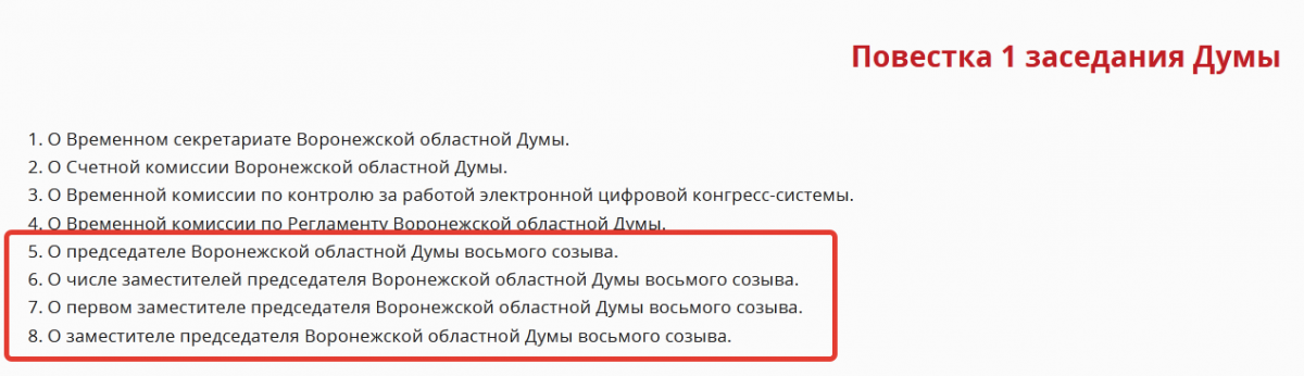 В повестке 1 заседания областной думы VIII созыва насчитывается 8 вопросов. Главный под №5 значится как избрание председателя Воронежской областной Думы.