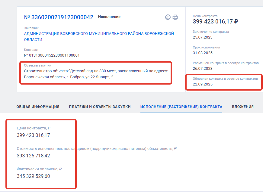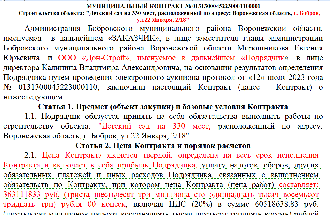 скриншот из контракта на строительство детского садика на 330 мест в городе Бобров