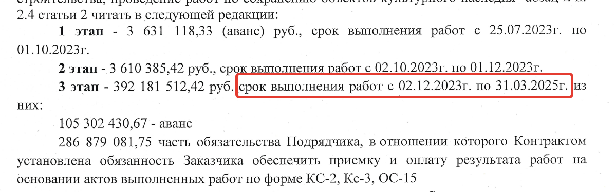 При этом в очередном допсоглашении "задним числом" (допсоглашением №9, от 18 сентября текущего года) было записано, что срок выполнения работ переносится на 31 марта 2025 года, то есть время проведения работ было увеличено на 4 месяца. А их стоимость выросла почти на 40 млн рублей, когда работы должны были быть уже завершены.