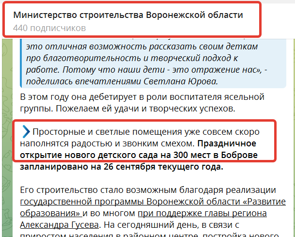Во-первых, странно, что в сообщении Минстроя говорится об открытии детского садика в городе Бобров на 300 мест.