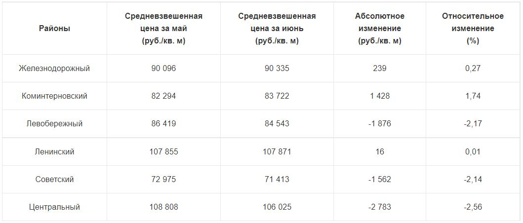 Выросли цены сильнее всего в Коминтерновском районе — на 1428 рублей, или на 1,74%, за «квадрат». В Железнодорожном и Ленинском районах с мая цены практически не изменились.