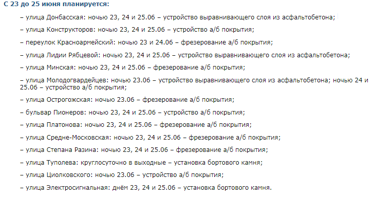 Как сообщает пресс-служба городской администрации, с 23 июня по 25 июня работы планируются на четырнадцати улицах. На большинстве из участков пройдет устройство и фрезерование покрытия, также запланирована установка бортового камня.