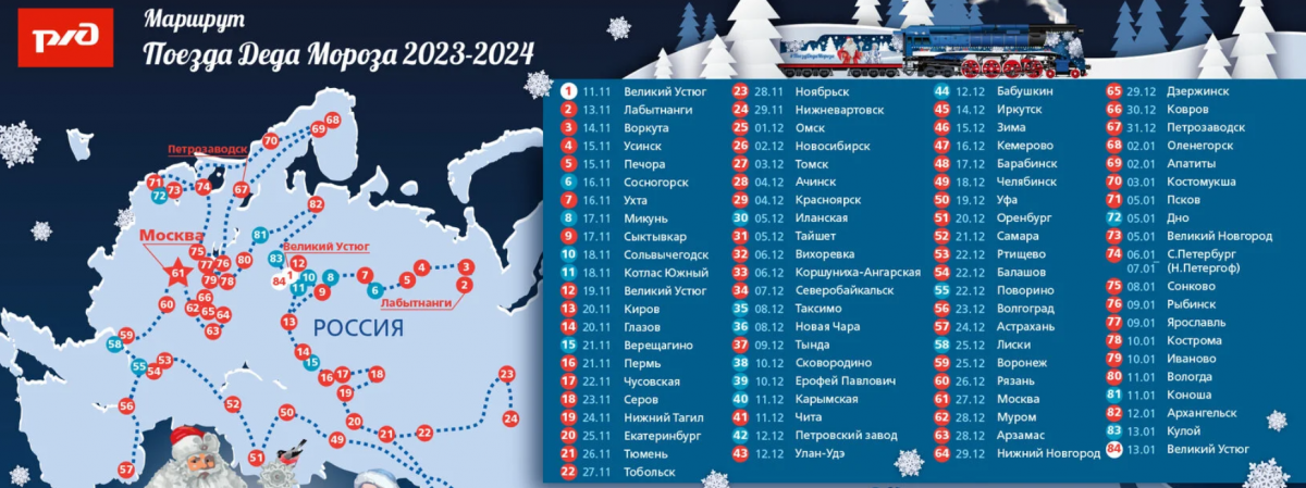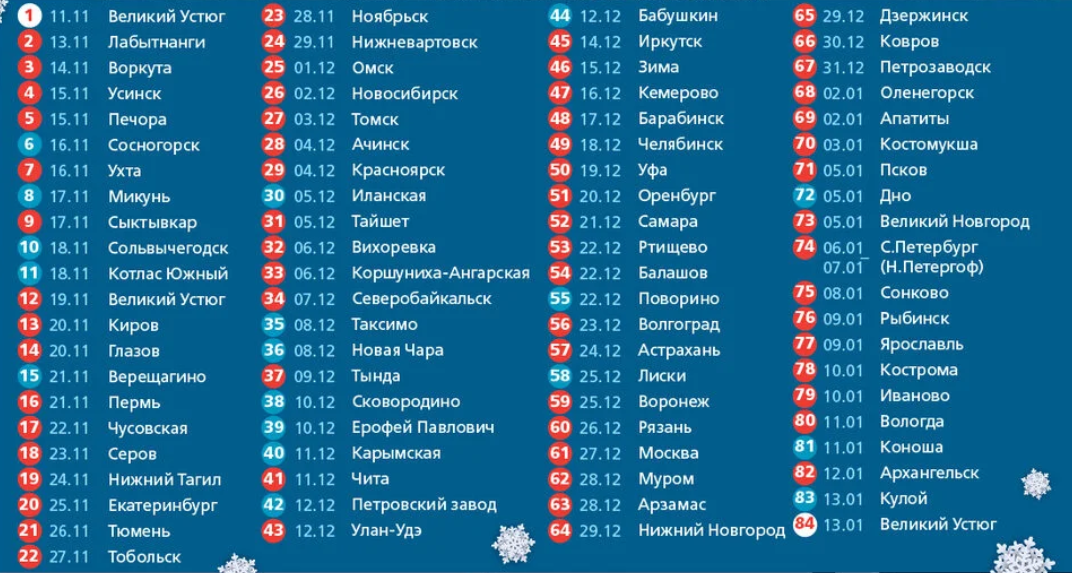 Обнародован маршрут поезда, который будет служить передвижной декабрьской резиденцией Деду Морозу. Он стартует из Великого Устюга, проедет по северу через Воркуту и Печору, погостит в Перми и Екатеринбурге, побывает в Омске и Томске, развернется через Уфу и Самару, приедет к нашим соседям в Лиски, а затем, 25 декабря, наконец, прибудет в Воронеж. И у нас Дед Мороз окажется даже раньше, чем в столице.