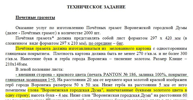В четверг на сайте госзакупок Воронежская гордума опубликовала информации о закупке сразу 2000 бланков Почетных грамот и 1800 бланков Благодарственных писем. Общая сумма закупки может составить не более 287,5 тыс рублей.