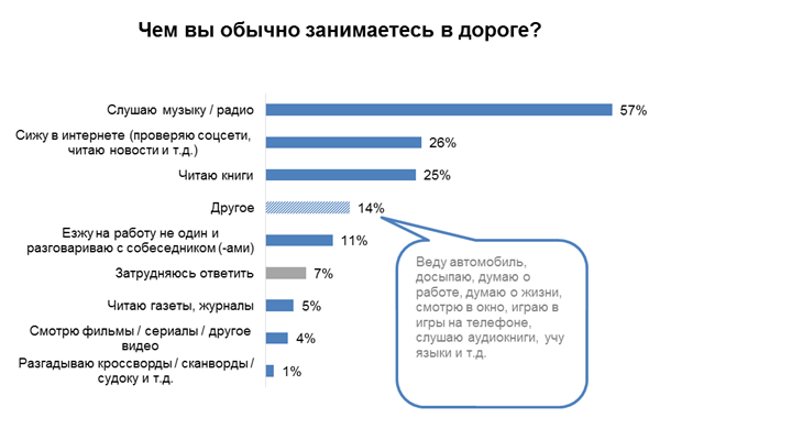 Следующим вопросом для респондентов был: "Чем вы занимаетесь в пути?" 57% воронежцев предпочитают слушать музыку и радио. 26% - в пути на работу сидят в интернете: проверяют соц. сети, читают новости и др. 25% опрошенных читают книги, 4% - смотрят сериалы.