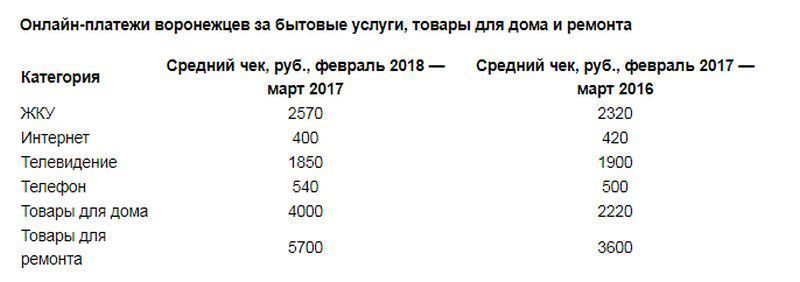 Особенно воронежцы стали больше платить через интернет за коммунальные услуги. За год количество таких платежей выросло в 1,3 раза, а самих плательщиков – в 1,4 раза. В среднем воронежцы ежемесячно тратили на жилищно-коммунальные услуги 2570 рублей. А за позапрошлый период эта цифра была меньше — 2320 рублей.