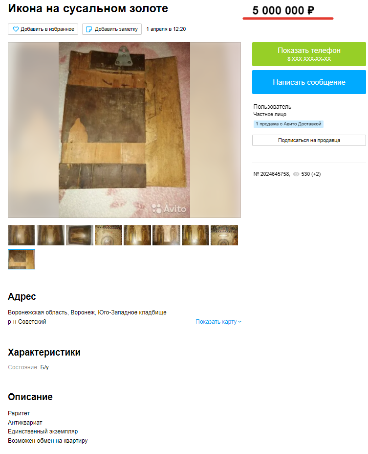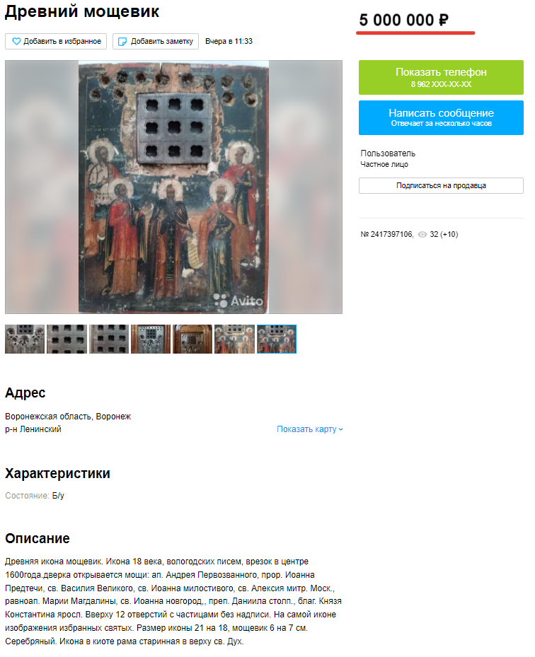 Второе предложение – древняя икона с мощевиком – опубликовано продавцом из Ленинского района 30 апреля. Эта икона с частицами святых продается за 5 млн руб, обмена на недвижимость в данном случае нет.