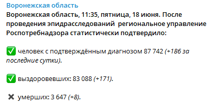 Согласно статистике оперативного штаба по коронавирусу, 18 июня в регионе диагноз подтвердился еще у 186 человек. Количество инфицированных уже достигло 87 742.