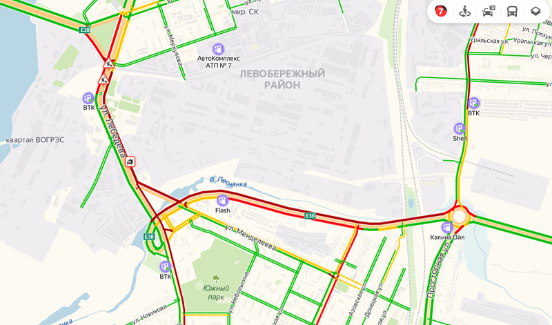 Согласно информации сервиса "Яндекс Карты", на данный момент пробка в Левобережном районе оценивается в семь баллов. Средняя скорость движения машин не превышает пяти километров в час. Особенно трудно проехать по улицам Лебедева, Менделеева, Ильюшина, Волгоградской, Ростовской, переулку Отличников и Вогрэсовскому мосту по направлению на Левый берег.