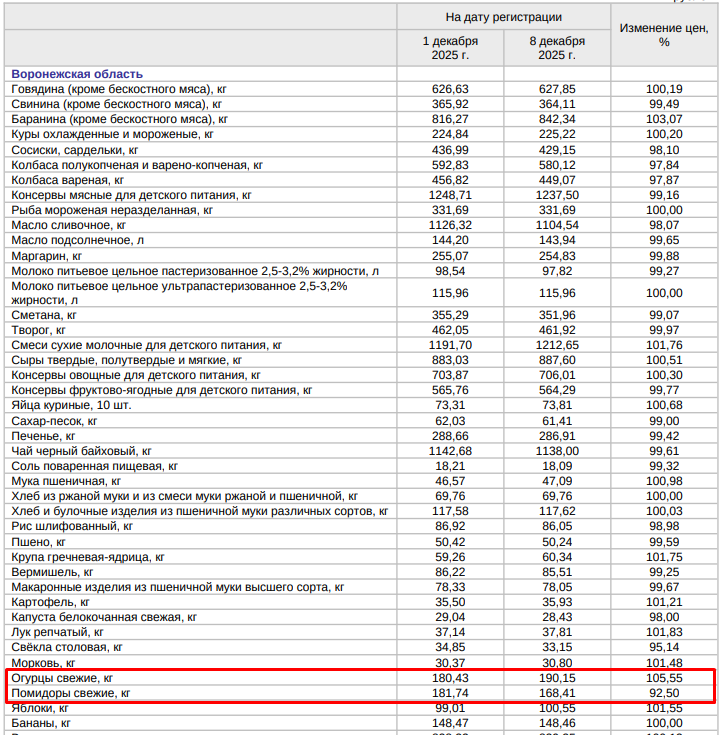Но есть и хорошие новости. Свежие помидоры после космического роста подешевели. Их стоимость за неделю упала со 181 руб 74 коп до 168 руб 41 коп.