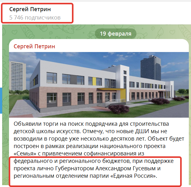 Сергей Петрин в своем ТГ-канале особо подчеркивает, что строительство стало возможным «при поддержке проекта лично Губернатором Александром Гусевым и региональным отделением партии «Единая Россия». Получается, что другие политические партии выступали против этого строительства или отнеслись к нему нейтрально? Очевидно, что такая политическая реклама градоначальникам дается не случайно, ведь уже в сентябре будут проводиться выборы в Госдуму.