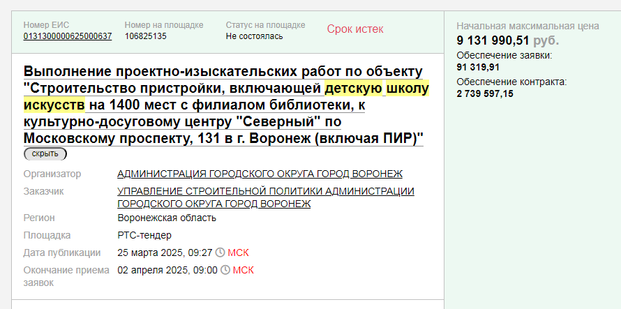скриншот сайта госзакупок, окончательная цена на проектирование воронежской ДШИ увеличилась почти на 914 тысяч рублей