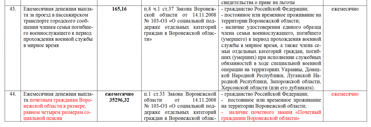 Стоит добавить, что ежемесячные социальные выплаты для почетных граждан по размеру являются одними из самых больших, если не считать выплаты по беременности и рождения детей. А размеры некоторых социальных выплат в Воронежской области выглядят более чем странными. Так, чиновниками и депутатами областной думы определен размер (в 165 рублей 16 копеек) ежемесячной выплаты за проезд в пассажирском транспорте городского сообщения членам семьи погибшего военнослужащего в период прохождения военной службы в мирное время. Сегодня этого ежемесячного "пособия" хватит всего на 4 (четыре) автобусных поездки в Воронеже или в других местных городах или на один день, если ехать на работу или иным делам с пересадками.