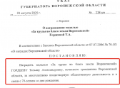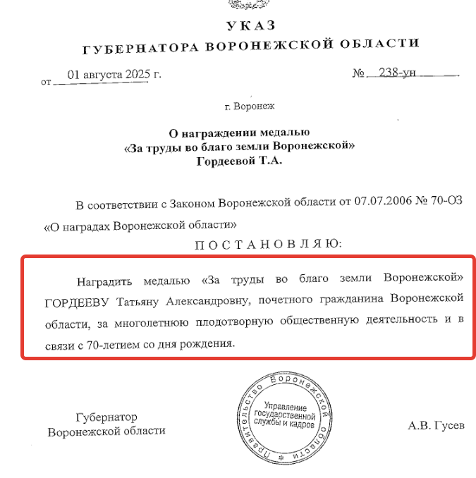 В тот же день был опубликован Указ губернатора о награждении медалью «За труды во благо земли Воронежской» Гордеевой Т.А. Документ был подписан еще 1 августа. Кстати, 6 августа такой же награды был удостоен другой юбиляр – 70-летний Владимир Верзилин, легенда воронежской Госавтоинспекции, депутат облдумы.