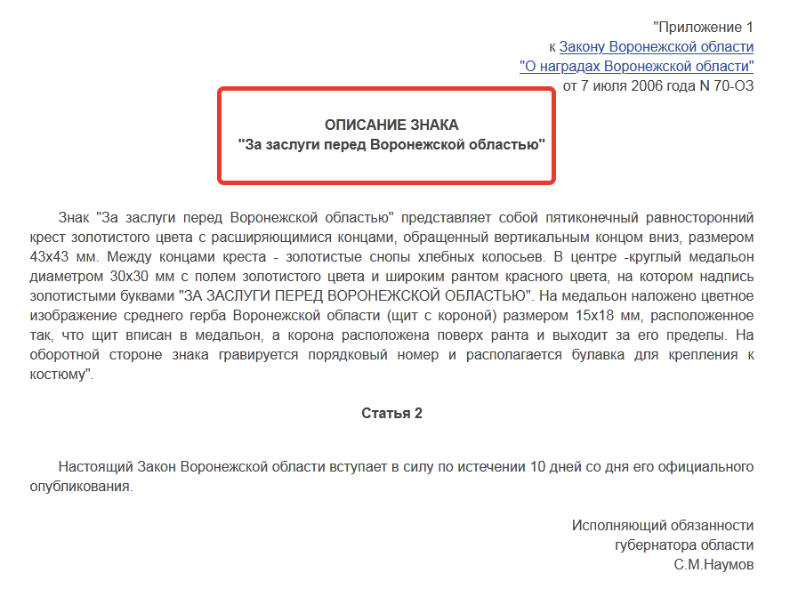 Данная награда появилась на воронежской земле в 2006 году во времена тогдашнего губернатора Владимира Кулакова, а поправки в закон "О наградах..." , где говорилось о новом знаке - "За заслуги перед Воронежской областью" - подписал на тот момент и. о. губернатора Сергей Наумов.