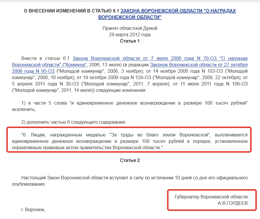 скриншот из поправок в закон "О наградах Воронежской области", 2012 г. Через 13 лет эту медаль и денежное вознаграждение в 100 тыс рублей получит его супруга из рук уже другого губернатора